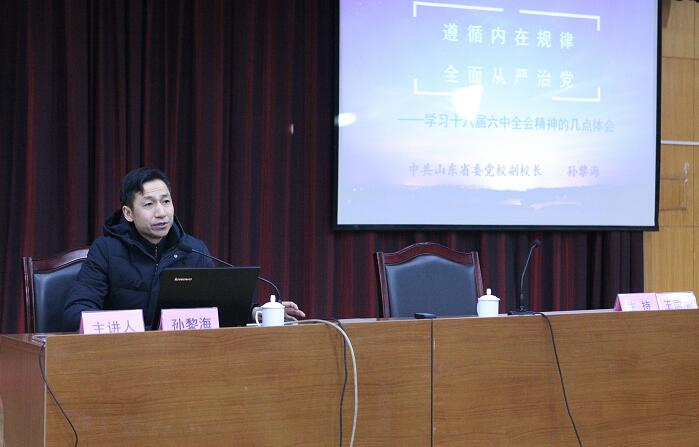 活動首先由山東省委黨校孫黎海副校長為集團公司黨員干部進行十八屆六中全會精神解讀,并對黨風廉政建設形勢、任務要求以及工程建設企業存在的問題與對策進行專題輔導。孫校長用形象的語言、生動的事例,給集團公司黨員干部上了一堂深刻的專題輔導課,既有理論性又有實踐性,有高度、有水平,整個報告脈絡清晰、生動形象,對黨的十八屆六中全會的新思想、新觀點、新要求做了分析和詳細解讀,報告理論性、思想性、操作性都很強,對集團公司全面理解和把握十八屆六中全會精神具有很強的指導意義。