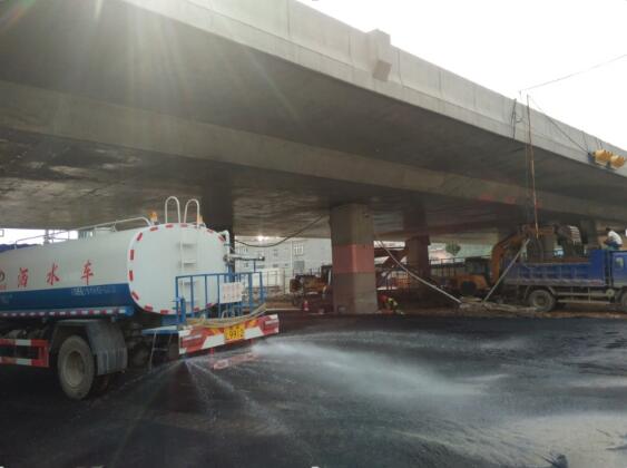 根據領導要求,第三分公司加大了人員及設備投入力度,現場現場管理人員達20余人,投入各類機械11臺,同時配備了灑水車、霧炮等設備,以確保施工中的揚塵控制。為保證渣土及時運出,項目部組織38輛小渣土車輪流作業進行清運。為縮短工期,項目部采取了碾壓混凝土施工工藝,做到了施工快,強度高,縮縫少,耐久性好,水泥用量少,減少施工環境污染,有效保證了施工進度和工程質量,將施工對市民生活、出行造成的影響降到最小,以確保工程盡早通車。