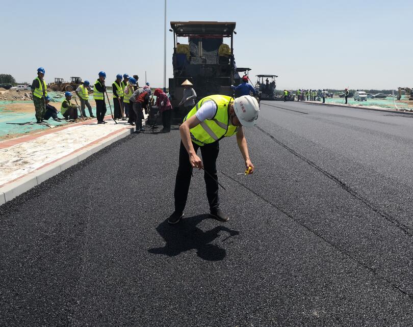 6月1日,是小朋友的節(jié)日,也是我一個難忘的日子,這天我完成了人生中第一次面層施工。這一天項(xiàng)目部全體人員齊上陣,做資料的小姐姐也帶上安全帽穿上反光背心拿起照相機(jī)全程搜集影像資料。施工現(xiàn)場機(jī)器轟鳴、人頭攢動,每個人都精神抖擻、干勁十足,即使夏日的驕陽、熾熱的瀝青也絲毫不能減少我們工作的熱情。在項(xiàng)目經(jīng)理的精心組織下,每個人都分工明確,從瀝青進(jìn)場溫度、高程控制、需鋪厚度、初壓厚度、壓實(shí)遍數(shù)、平整度等等任何一個細(xì)節(jié)都嚴(yán)格把關(guān)。歷經(jīng)6小時的不懈努力,終于圓滿完成了7號路800米的面層攤鋪工作。