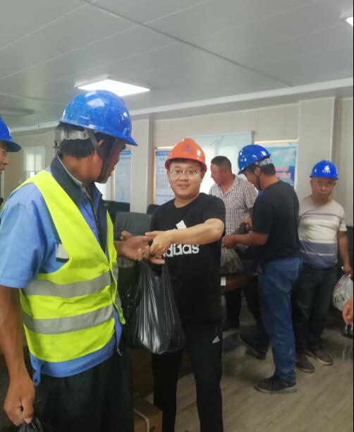 項目部提前策劃采購,為工友們精心準備了粽子、綠豆、藿香正氣水等防暑降溫用品,并親手將這份清涼發放到工友代表們手中。工友們捧著手里的粽子以及防暑降溫用品高興地說:“感謝項目領導的關心,讓大家感受到了濃濃的節日氛圍,我們也將鼓足干勁,克服困難,把手里的工程干好。”在活動現場,項目安全員也對高溫期間防暑降溫基本常識、施工作業注意事項等進行了安全宣傳教育,切實提高工友們的高溫中暑安全預防意識和急救能力。