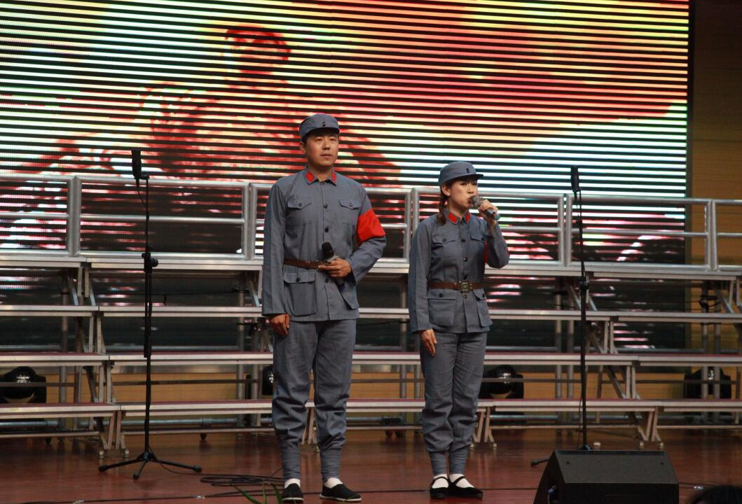 ?? 紅歌會活動現場,《鼓浪嶼之波》《歌唱祖國》《山丹丹開花紅艷艷》《我愛你中國》《我和我的祖國》《祖國不會忘記》《天耀中華》等十七首經典愛國歌曲輪番上演,歌聲在會場上空飄蕩。集團公司現場合唱的是紅色經典歌曲《在太行山上》。歌曲由三個部分組成。第一部分為詩歌朗誦。表達了抗戰時期中國軍民艱苦卓絕的奮斗歷程和大無畏的革命樂觀精神;第二部分為情景表演。描繪了八路軍戰士們在戰場上揮舞著紅色旗幟,在沖鋒的號聲中,向敵人的陣地發起沖鋒,受傷的戰士在衛生員和戰友的攙扶下在戰場上繼續前進的場景。第三部分為歌曲合唱。演員們身著八路軍軍裝,精神抖擻,情緒高昂,歌聲嘹亮,仿佛把大家帶入了戰火紛飛的年代,給人以催人奮進,所向披靡的力量,兩個聲部相互配合,高低呼應,逐步將歌曲推向高潮。